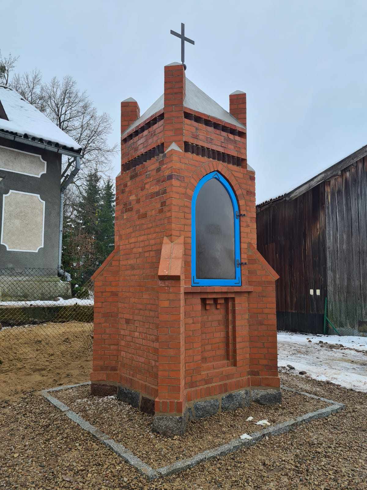 W 2021 r. kapliczkę zbadał konserwator dzieł sztuki. Okazało się wtedy, że przy tak dużej skali zniszczeń większość prac konserwatorskich, jak na przykład mycie, jest niemożliwa do realizacji bez zmiany lokalizacji i następnie rekonstrukcji kapliczki. W uzgodnieniu z gminą Jonkowo kapliczka została przesunięta o 2 metry. Pod koniec czerwca rozpoczęły się prace restauratorskie i roboty budowlane. Objęły m.in. mycie, dezynfekcję cegieł oraz kamieni z glonów i porostów, odkorodowanie krzyża, uzupełnienie ubytków, montaż nowego, drewnianego okna, tynkowanie i zabezpieczenie mikrobiologiczne.