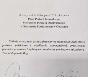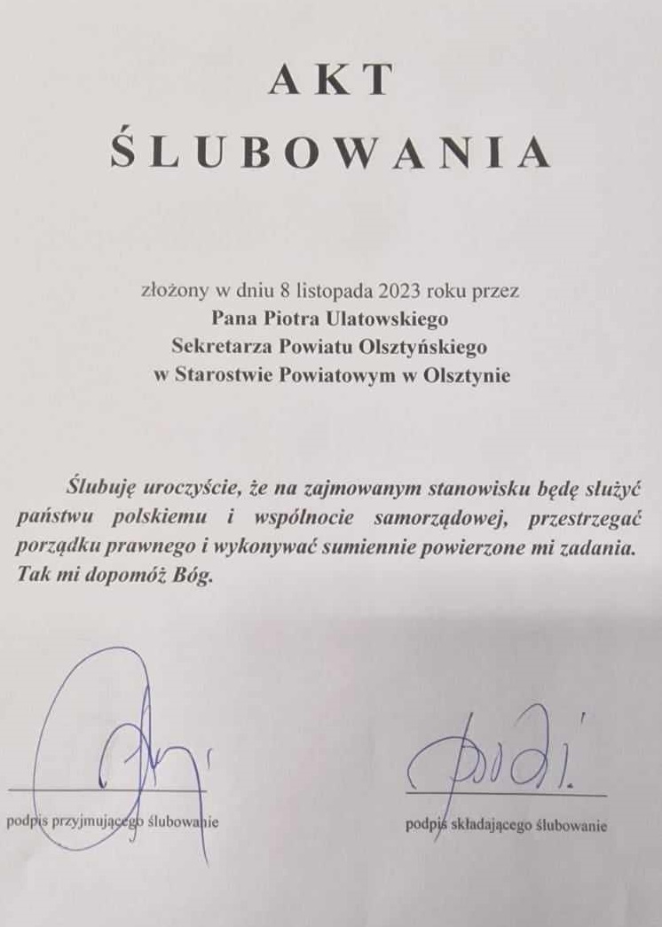 Od 8 listopada 2023 r. funkcję Sekretarza Powiatu Olsztyńskiego pełni Piotr Ulatowski. Z samorządem związany jest od 2000 r., kiedy to rozpoczął prace w Starostwie Powiatowym w Olsztynie. Przez wiele lat był kierownikiem Biura Rady Powiatu. Serdecznie gratulujemy Panu Sekretarzowi i życzymy mu powodzenia oraz wielu sukcesów na nowym stanowisku.