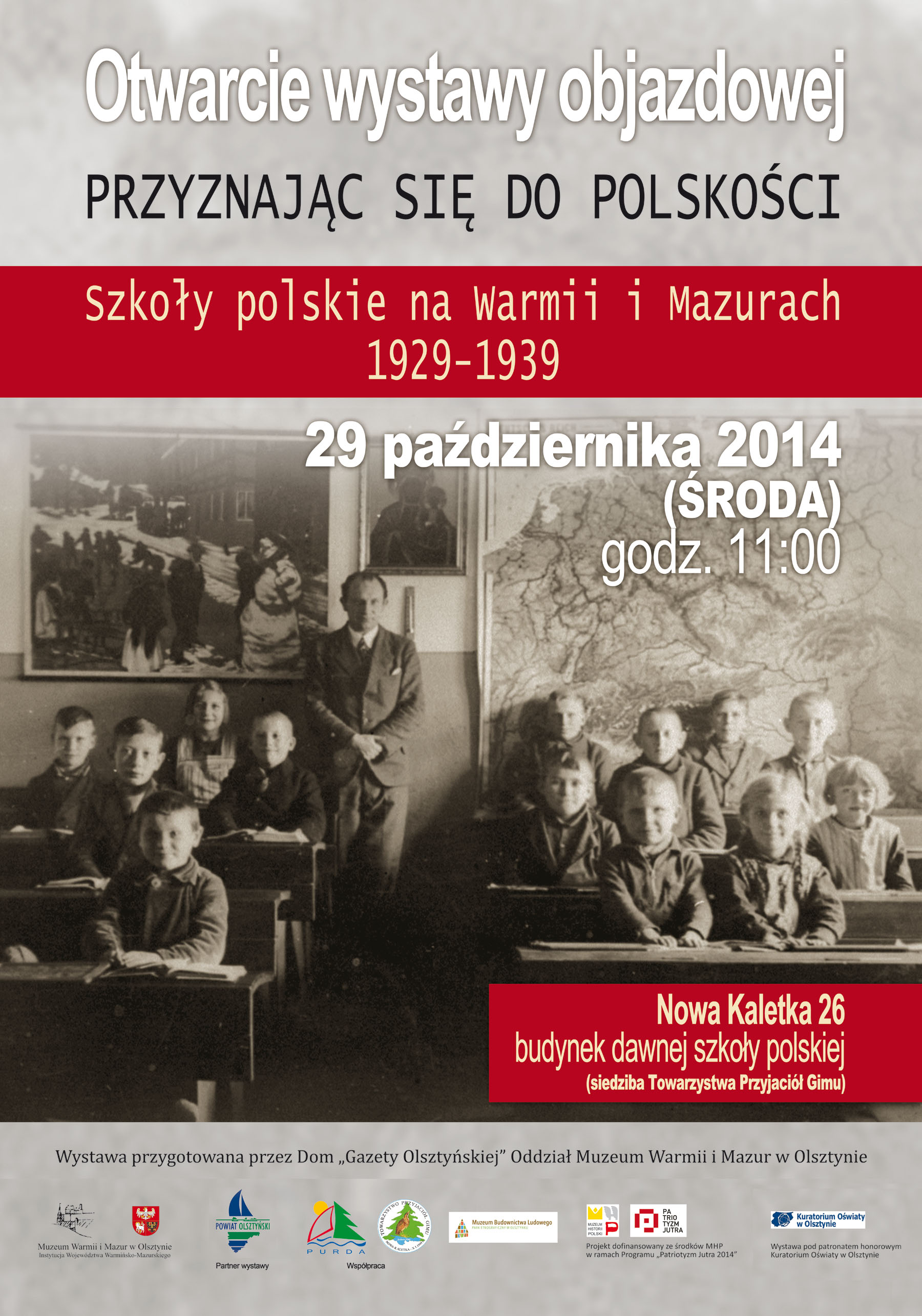 29 października 2014 o godz. 10 zapraszamy do Nowej Kaletki na wernisaż wystawy objazdowej "Przyznając się do polskości. Szkoły polskie na Warmii i Mazurach w latach 1929-39". Otwarcie wystawy odbędzie się w budynku dawnej polskiej szkoły, w której obecnie mieści się siedziba Towarzystwa Miłośników Gimu.