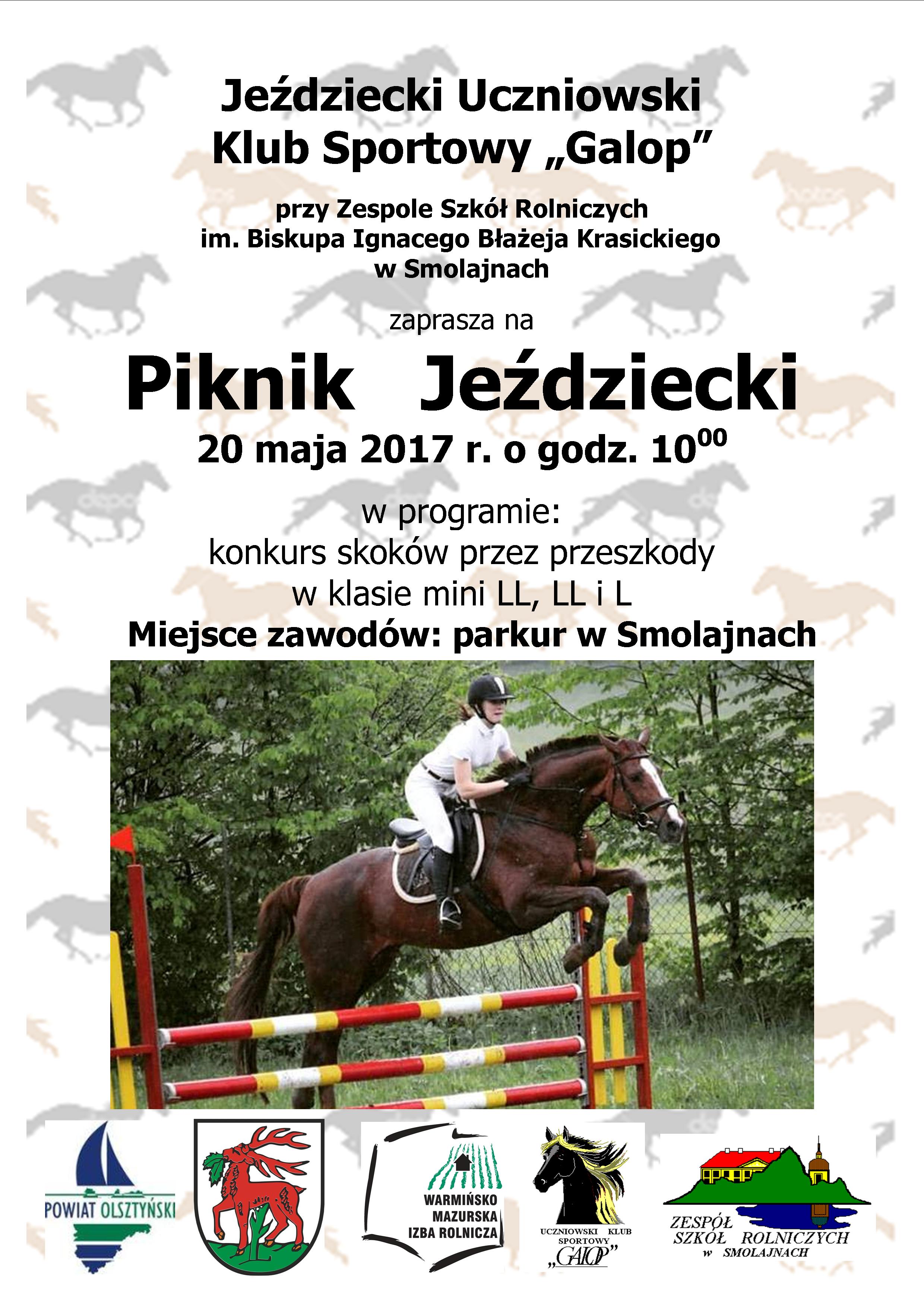 Jeździecki Uczniowski Klub Sportowy Galop przy Zespole Szkół Rolniczych im. Biskupa Ignacego Błażeja Krasickiego w Smolajnach zaprasza w sobotę 20 maja o godz. 10:00 na Piknik Jeździecki.