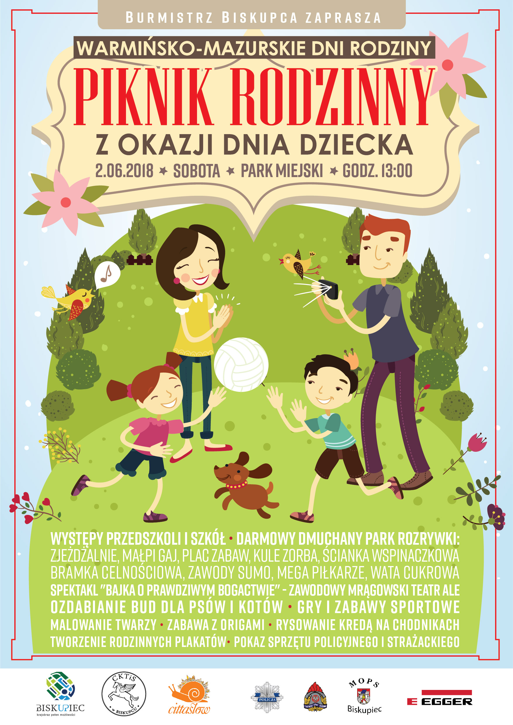 Burmistrz Biskupca zaprasza na Piknik Rodzinny z okazji Dnia Dziecka w ramach Warmińsko-Mazurskich Dni Rodziny, który odbędzie się 2 czerwca 2018r w Parku Miejskim o godz 13:00.