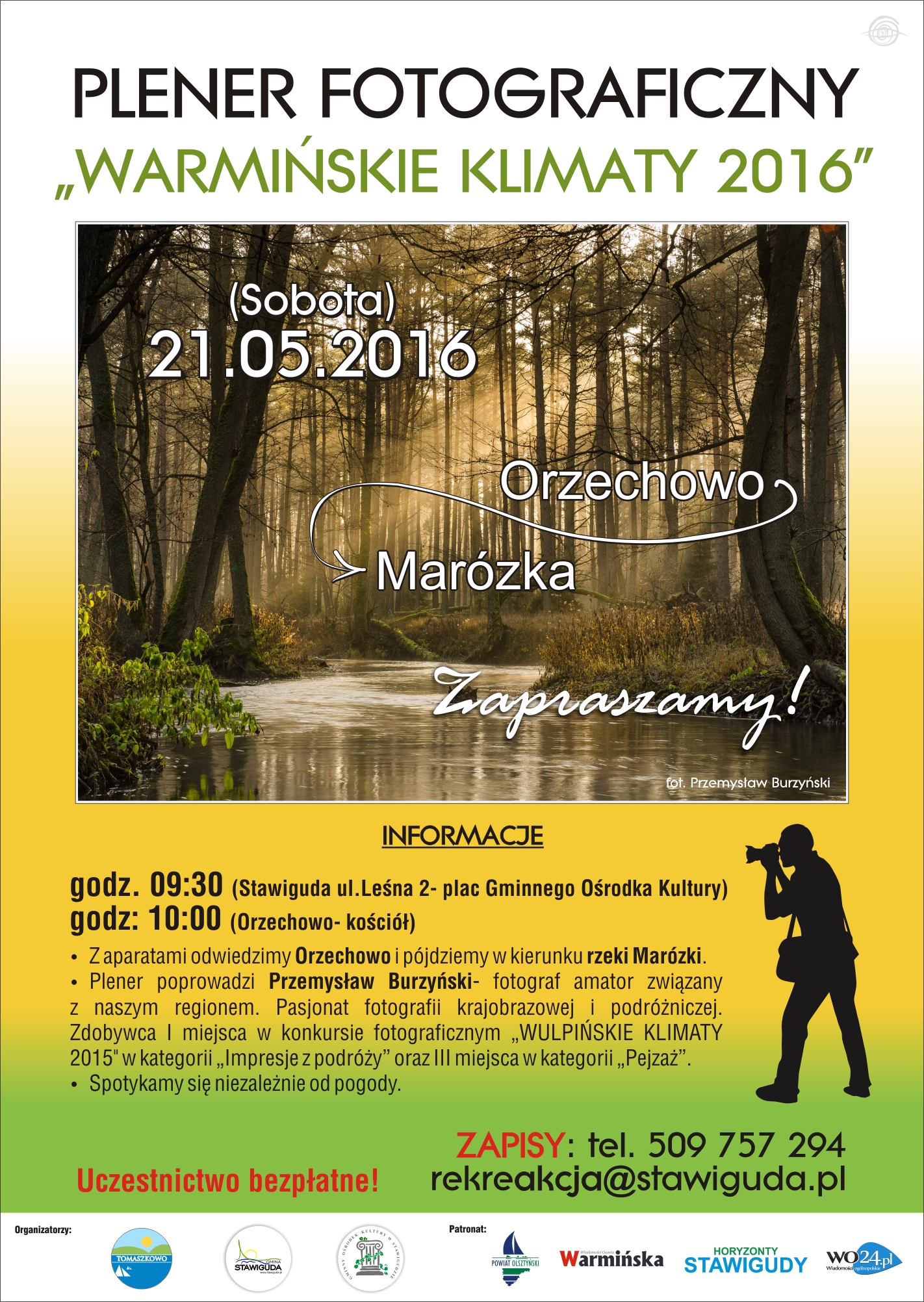 Gminny Ośrodek Kultury w Stawigudzie zaprasza w sobotę 21 maja 2016 roku, amatorów fotografii i miłośników warmińskich krajobrazów na plener fotograficzny. Spotkanie poprowadzi Przemysław Burzyński- fotograf amator związany z regionem. Pasjonat fotografii krajobrazowej i podróżniczej. Zdobywca I miejsca w konkursie fotograficznym „WULPIŃSKIE KLIMATY 2015" w kategorii „Impresje z podróży” oraz III miejsca w kategorii „Pejzaż”. Spotkanie odbędzie się niezależnie od pogody.W planach - spacer z aparatami, odwiedziny Orzechowa i przejście w kierunku rzeki Marózki.