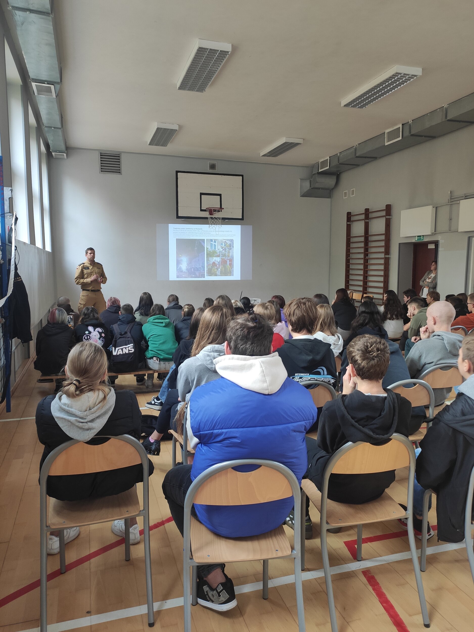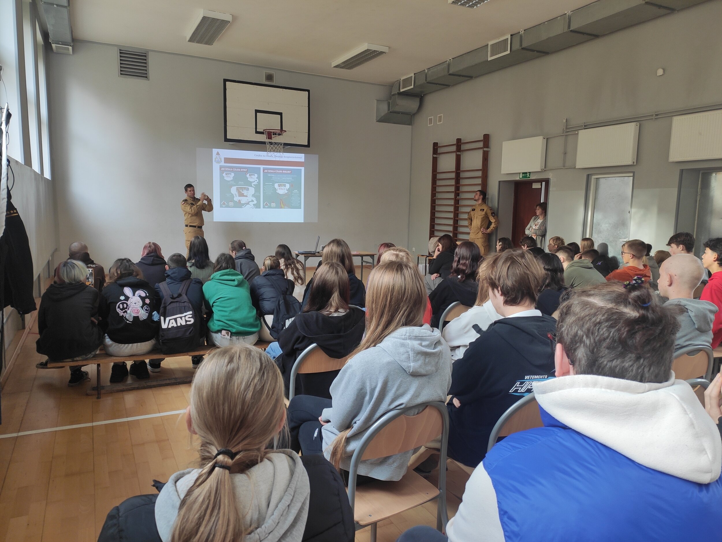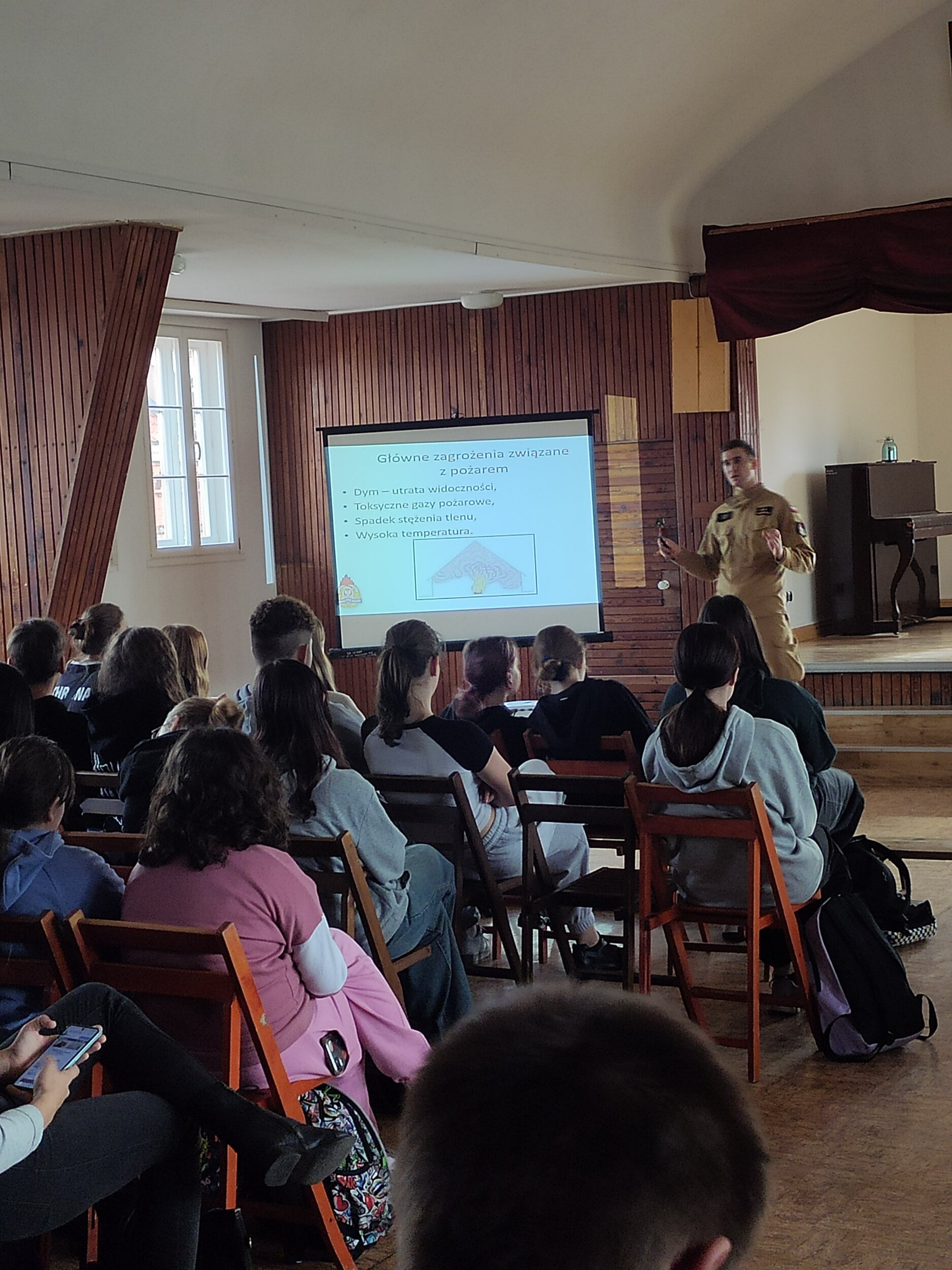 Podczas spotkań omówione zostały zagrożenia związane z niewłaściwym użytkowaniem pieców na paliwo stałe lub gazowe oraz nieprawidłowym korzystaniem z przewodów kominowych i wentylacyjnych. Przedstawione zdjęcia, filmy odzwierciedlające autentyczne sytuacje oraz instruktaże zachowania bezpieczeństwa miały na celu skupienie uwagi młodzieży na zapamiętaniu ważnych zasad, które mogą uratować życie i zdrowie.
