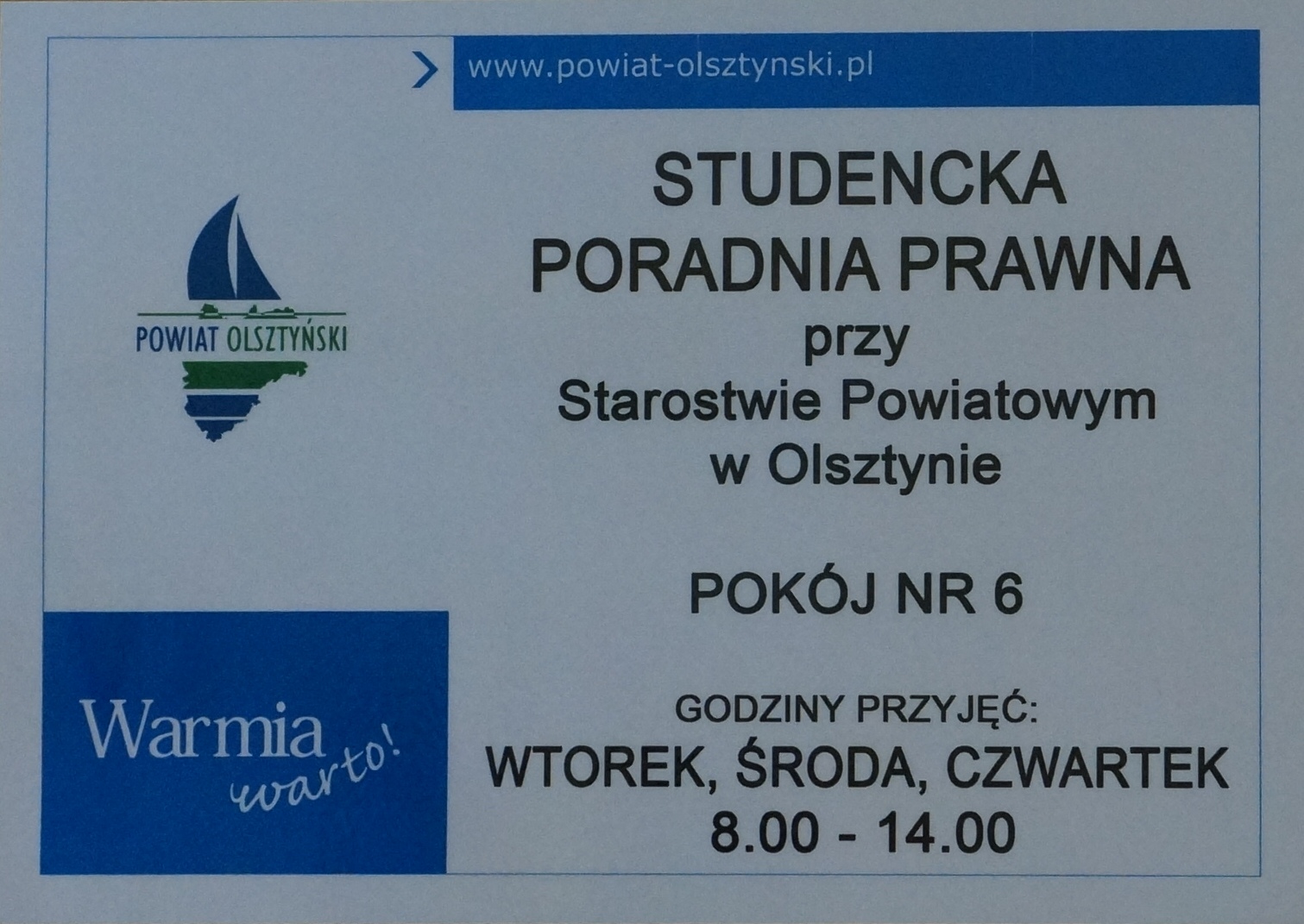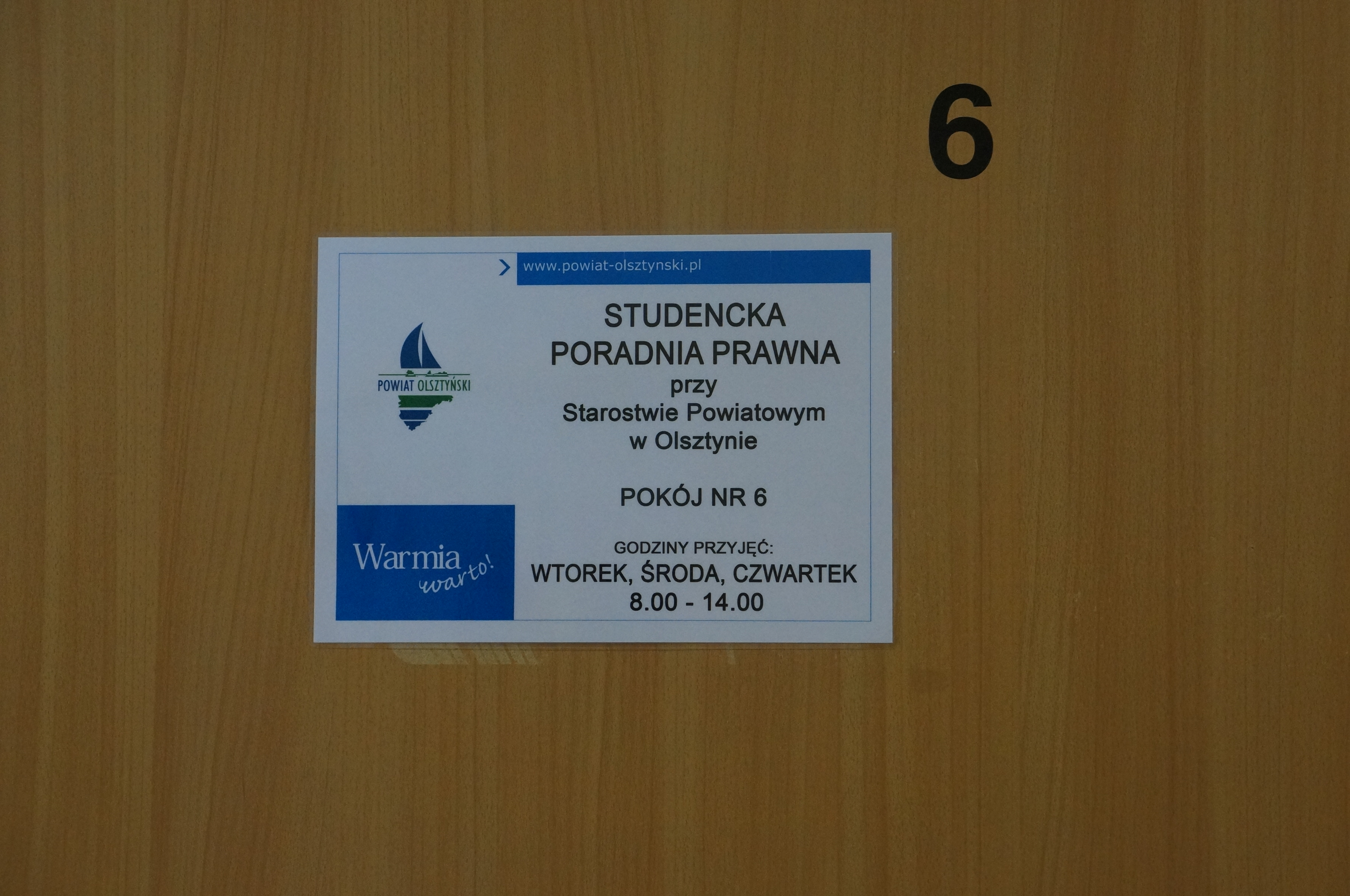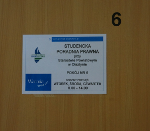 Studencka Poradnia Prawna funkcjonuje w budynku Starostwa Powiatowego w Olsztynie przy placu Bema 5, w pokoju nr 6 (wspólny korytarz z Powiatową Poradnią Psychologiczno-Pedagogiczną), we wtorki, środy i czwartki w godzinach 8.00-14.00.