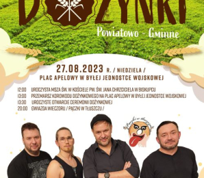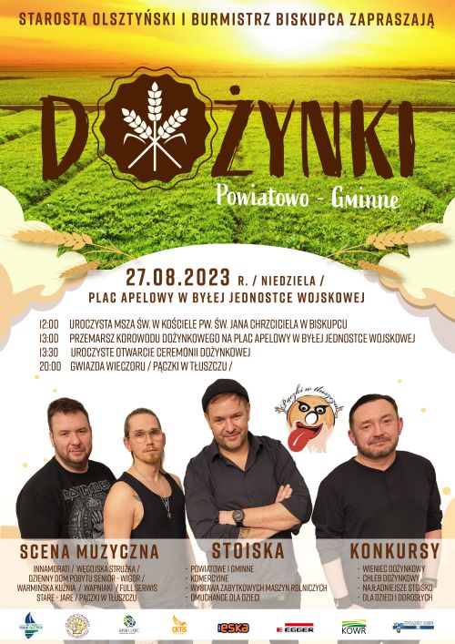 Starosta Olsztyński i Burmistrz Biskupca zapraszają na Powiatowo-Gminne Dożynki, które odbędą się w niedzielę 27 sierpnia 2023 roku w Biskupcu.