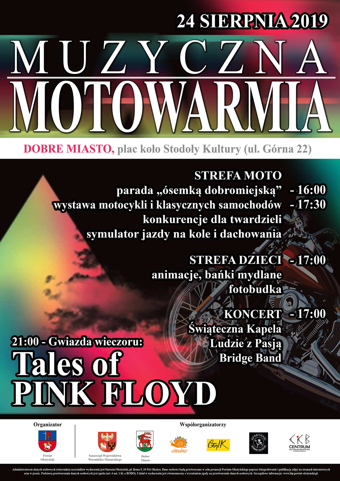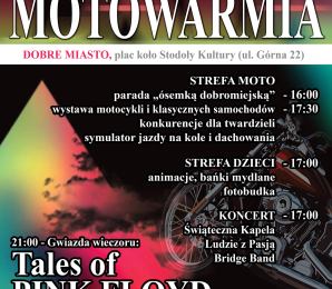 24 sierpnia zapraszamy wszystkich miłośników motocykli i muzyki Pink Floyd do Dobrego Miasta. Tu na placu przy Stodole Kultury (ul. Górna 22) odbędzie się "Muzyczna MOTOWARMIA".W programie parada motocykli i klasycznych samochodów, strefa zabaw dla najmłodszych, koncert lokalnych zespołów: Świąteczna Kapela, Ludzie z Pasją, a także rockowego Bridge Band z Olsztyna. Gwiazdą wieczoru będzie Tales of Pink Floyd, czyli cover band wykonujący utwory Davida Gilmoura i Rogera Watersa w autorskich aranżacjach.