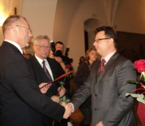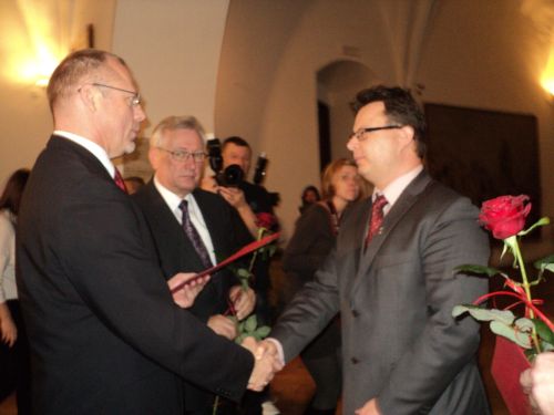 Radny Piotr Duda odbiera nagrodę za wybitne osiągnięcia w dziedzinie pomocy społecznej z rąk marszałka Jacka Protasa