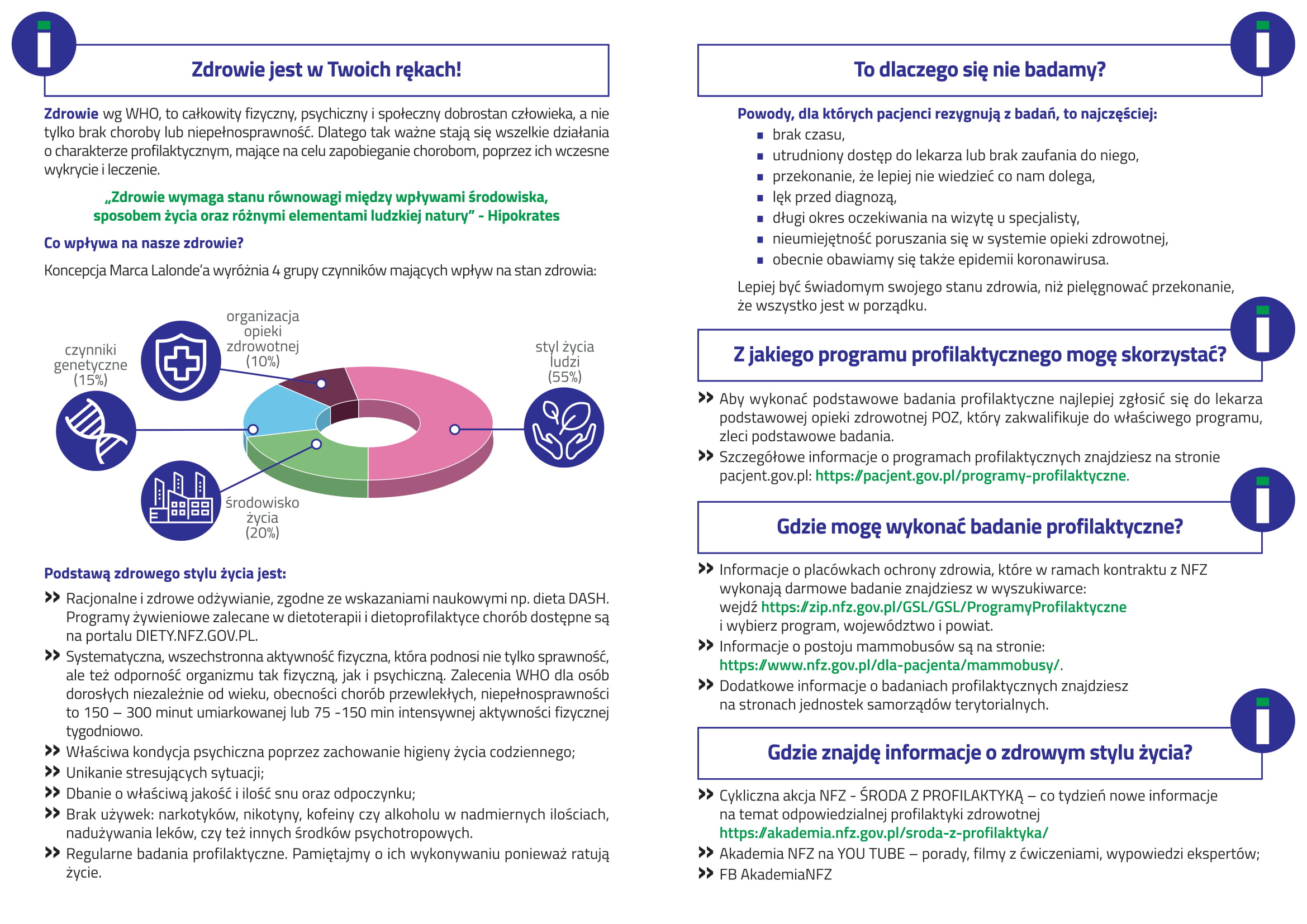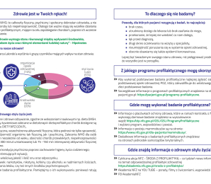 Kobiety w Polsce żyją o 8 lat dłużej niż mężczyźni. Co skraca życie? Palenie papierosów, nieprawidłowa dieta, mała aktywność fizyczna, stres, ale także późne zgłaszanie się na badania profilaktyczne. Profilaktyka zdrowotna to dłuższe i lepsze życie. Z jakiego programu badań profilaktycznych można skorzystać? Gdzie wykonać bezpłatne badania? Jak znaleźć informacje o zdrowym stylu życia? Zachęcamy do lektury materiałów NFZ na ten temat, przygotowanych w ramach cotygodniowej akcji "Środa z profilaktyką".