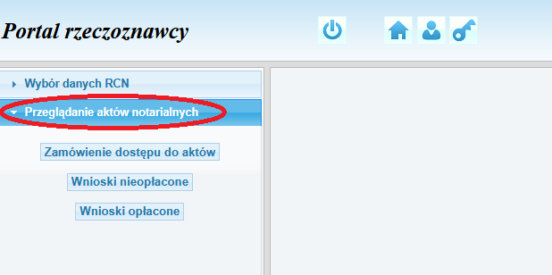 Aby zamówić wgląd do aktów notarialnych należy zalogować się w module rzeczoznawcy majątkowego a następnie z listy znajdującej się po lewej stronie wybrać: ,,Przeglądanie aktów notarialnych”.
