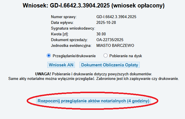 Po złożeniu i opłaceniu wniosku udostępniony zostanie dostęp do bazy aktów notarialnych. Aby zacząć przeglądać zbiory dokumentów należy kliknąć w ,,Rozpocznij przeglądanie aktów notarialnych”. Dostęp do bazy będzie możliwy przez 4 godziny.