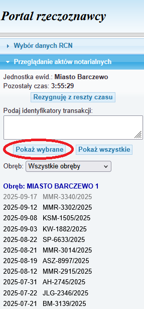 Przeglądać można wszystkie akty notarialne z zamówionej jednostki ewidencyjnej lub wyszukać wybraną transakcję- posługując się jej identyfikatorem.