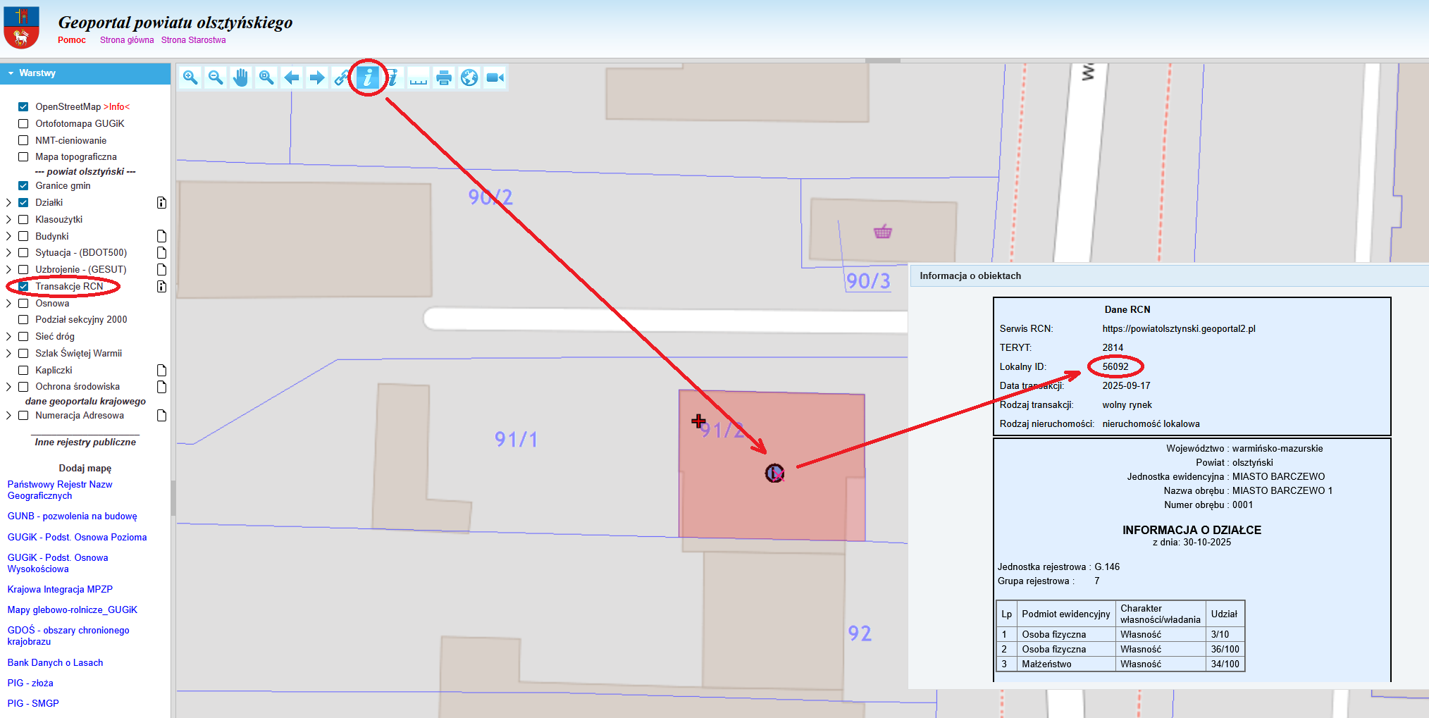 Identyfikator transakcji można m.in. pozyskać z poziomu mapy w geoportalu Powiatu Olsztyńskiego. Przy pozyskiwaniu informacji należy zaznaczyć ,,Transakcje RCN” w menu z warstwami.