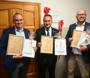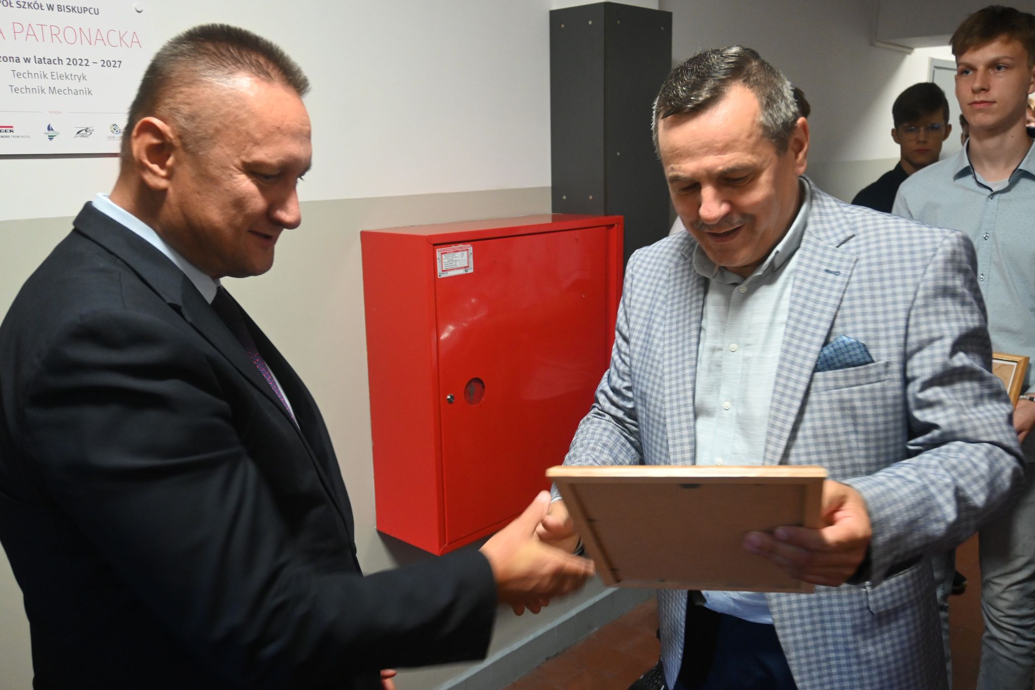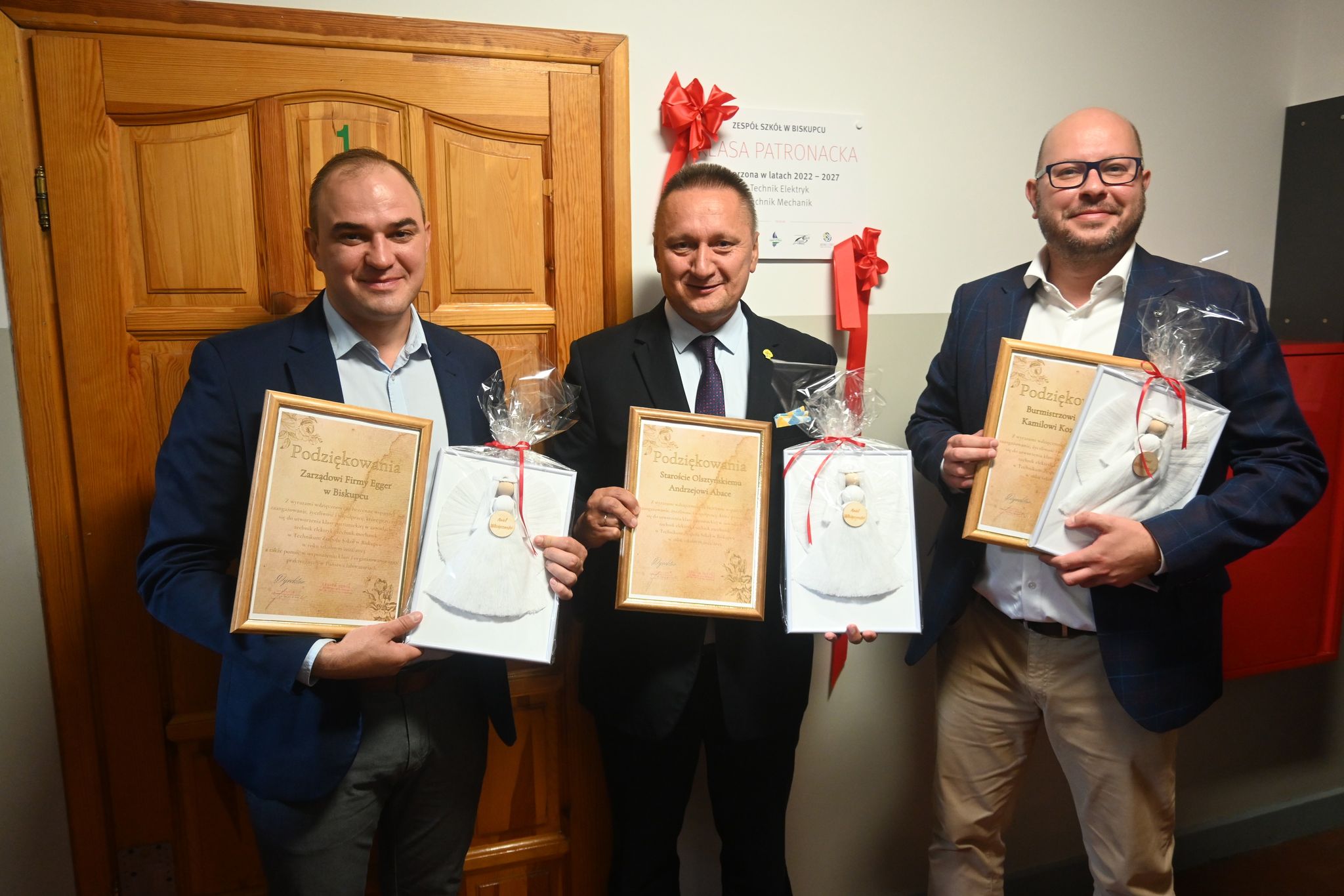 Starosta i przedstawiciele firmy EGGER Biskupiec otrzymali upominki i dyplomy w ramach podziękowania od społeczności szkoły za zaangażowanie i współpracę, które przyczyniły się do utworzenia klasy patronackiej w Technikum Zespołu Szkół w Biskupcu w ubiegłym roku szkolnym.