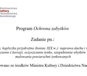 Dofinansowanie uzyskano w wyniku rozstrzygnięcia konkursu w ramach programu Ministra Kultury i Dziedzictwa Narodowego na rok 2022 Ochrona zabytków, którego strategicznym celem jest zachowanie materialnego dziedzictwa kulturowego poprzez konserwację i rewaloryzację zabytków nieruchomych i ruchomych oraz ich udostępnianie na cele publiczne.