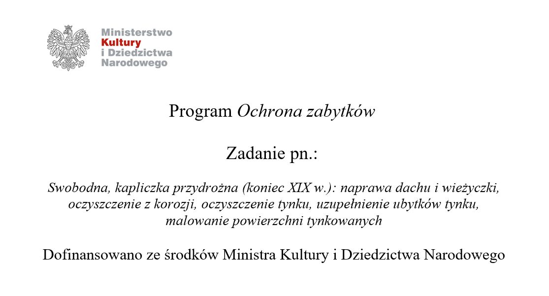 Dzięki dofinansowaniu Ministra Kultury i Dziedzictwa Narodowego XIX-wieczna kapliczka przydrożna w Swobodnej odzyska dawny blask. Umowa z 26 września 2022 r. zawarta pomiędzy Skarbem Państwa, reprezentowanym przez Ministra Kultury i Dziedzictwa Narodowego, a Powiatem Olsztyńskim dotyczy dofinansowania zadania pn. Swobodna, kapliczka przydrożna (koniec XIX w): naprawa dachu i wieżyczki, oczyszczenie z korozji, oczyszczenie tynku, uzupełnienie ubytków tynku, malowanie powierzchni tynkowanych. Zadanie jest dofinansowane ze środków finansowych MKiDN pochodzących z Narodowego Funduszu Ochrony Zabytków.