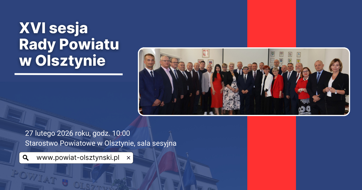 Informujemy, że 27 lutego 2026 roku o godz. 10:00 w sali sesyjnej nr 1 w siedzibie Powiatu Olsztyńskiego, Plac Bema 5 w Olsztynie, odbędzie się XVI Sesja Rady Powiatu w Olsztynie.
