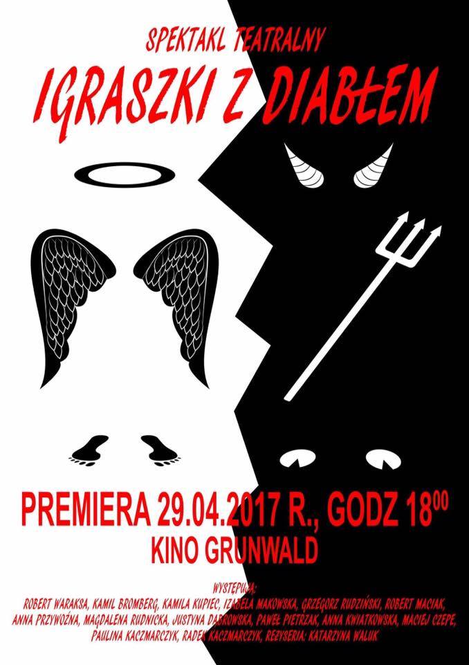 "Igraszki z diabłem" Jana Drdy będzie można zobaczyć w sobotę 29 kwietnia o godz. 18:00 w kinie Grunwald w Olsztynku. W role Marcina Kabata, bogobojnego Scholastyka, zabawnego Sarki Farki, dwóch niewinnych duszyczek, Kasi i królewny Disperandy, Anioła z ostatniego rzędu anielskiego chóru, a także diabłów różnej instancji: Lucjusza z tytułem magistra, Beliala, doktora Solfernusa, samego Belzebuba, wsiowych nicponi Omnimora, Karborunda i innych diabłów pospolitych wcielą się aktorzy-amatorzy, których na co dzień oglądamy w zupełnie innych odsłonach.