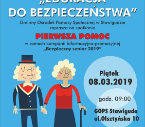 Gminny Ośrodek Pomocy Społecznej w Stawigudzie zaprasza w piątek 8 marca 2019 roku wszystkich seniorów oraz osoby niepełnosprawne z Gminy Stawiguda na spotkanie edukacyjne pt. "Pierwsza Pomoc" w ramach kampanii informacyjno- promocyjnej "Bezpieczny Senior 2019".
