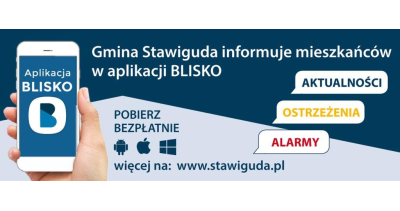 Wójt gminy Stawiguda zaprasza do korzystania z bezpłatnej aplikacji BLISKO (dawniej komunikator SISMS). Na aplikacje przesyłane będą multimedialne wiadomości o: zagrożeniach, tj.: jak wichury, gwałtowne burze, powodzie, skażenia, itp. awariach: wody, prądu i gazu bezpłatnych badaniach lekarskich i programach zdrowotnych imprezach...
