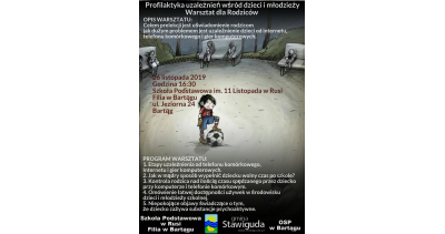 Gmina Stawiguda zaprasza na warsztaty dla rodziców poświęcone profilaktyce uzależnień dzieci i młodzieży. Spotkanie odbędzie się 26 listopad a 2019 r. o godz. 16:30 w Bartągu (Szkoła Podstawowa im. 11 Listopada w Rusi, Filia w Bartągu, ul. Jeziorna 24). Aby powiększyć plakat z programem, należy kliknąć w...
