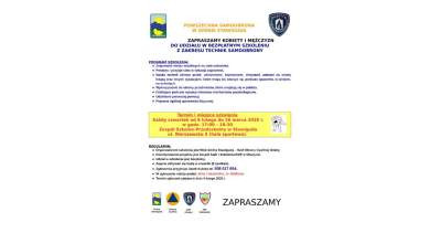 Gmina Stawiguda zaprasza kobiety i mężczyzn do udziału w bezpłatnym szkoleniu z zakresu technik samoobrony. Termin i miejsce szkolenia: każdy czwartek od 6 lutego do 26 marca 2020 r. w godz. 17:00 - 18:30 Zespół Szkolno-Przedszkolny w Stawigudzie, ul. Warszawska 5 (hala sportowa). Więcej informacji na załączonym plakacie.