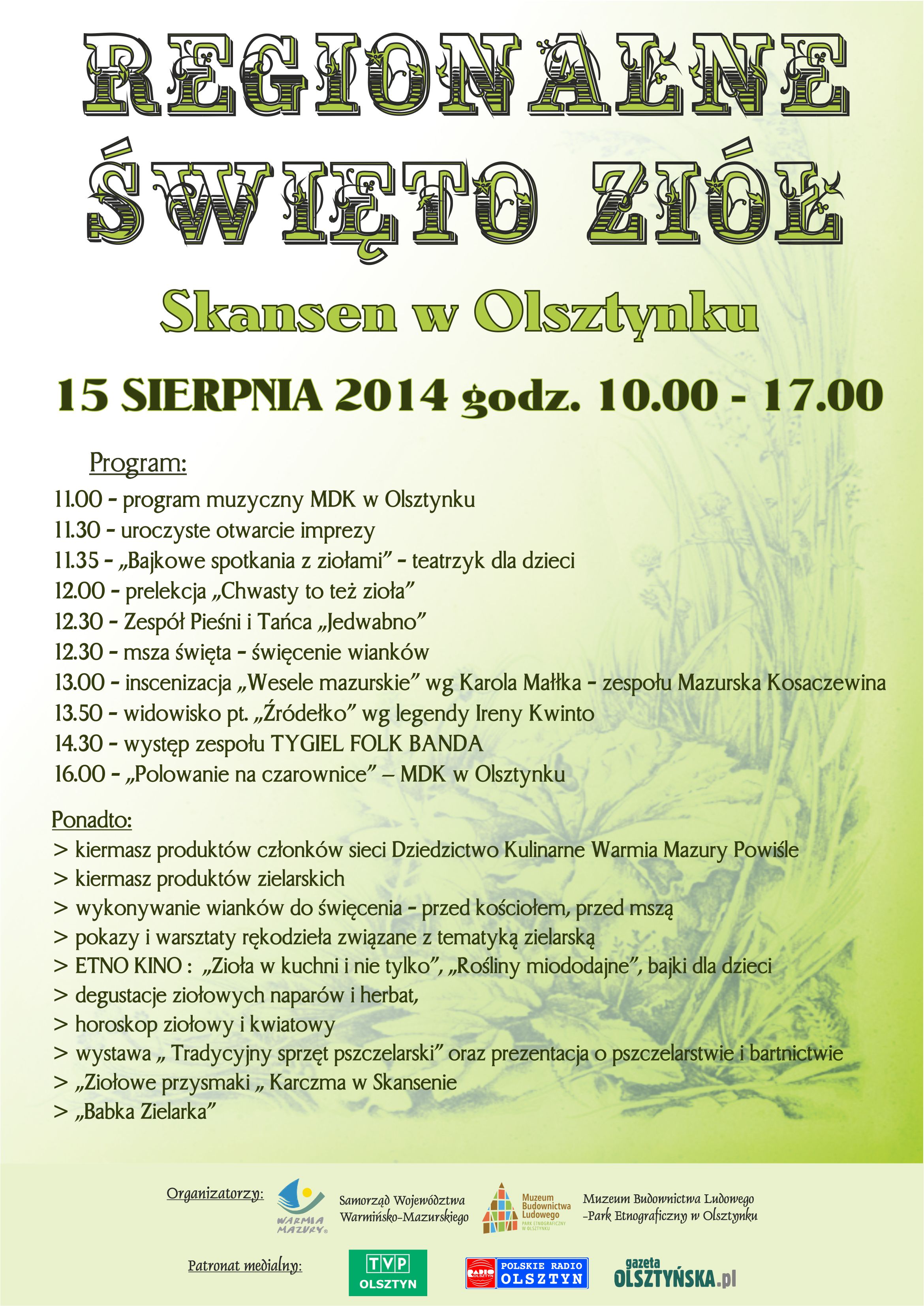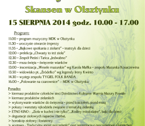 Zupa z pokrzyw, zapach świeżych ziół i święcenie wianków... 15 sierpnia w olsztyneckim skansenie odbędzie się Regionalne Święto Ziół, które na stałe wpisało się do kalendarza imprez Warmii i Mazur. Impreza organizowana od 2010 roku jest kontynuacją Jarmarków Pszczelarskich. Święto nawiązuje do ludowej tradycji święcenia ziół, kwiatów oraz zbóż, promuje zastosowanie ziół w tradycyjnej medycynie, kosmetyce i kulinariach oraz propaguje tradycje pszczelarskie. Jest to niezwykle barwne i aromatyczne święto.