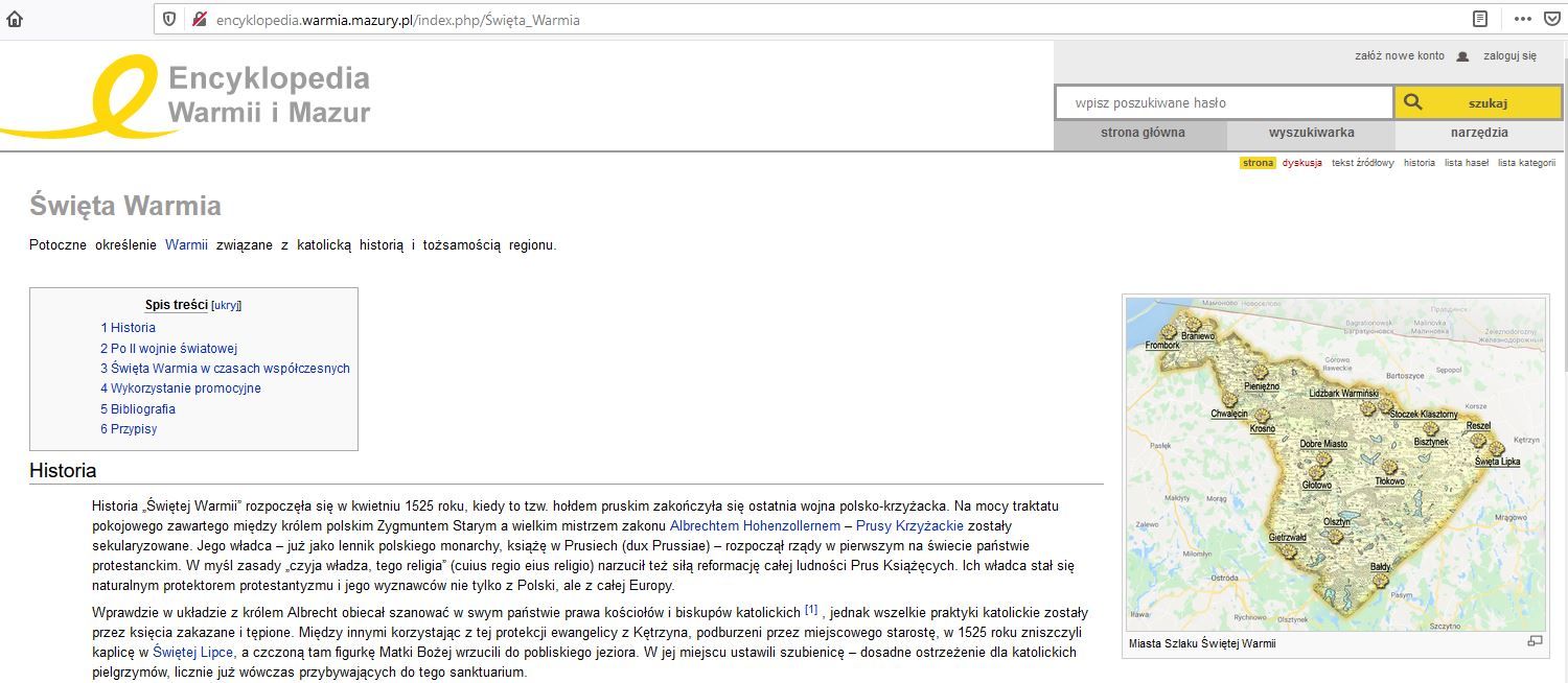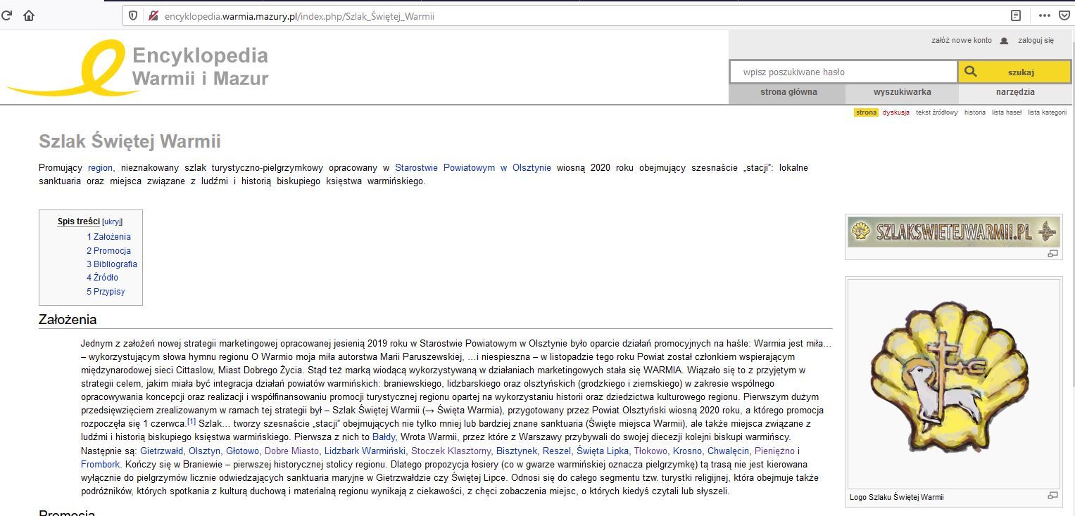 Po weryfikacji merytorycznej dokonanej przez naukowców-opiekunów Encyklopedii, pojawiły się w niej: ŚWIĘTA WARMIA – hasło opisujące historyczne źródła tego potocznego dziś określenia regionu związanego z jego katolicką tożsamością; ŚWIĘTE MIEJSCA WARMII – opis niezrealizowanego, niestety, ciekawego projektu utworzenia szlaku turystycznego obejmującego siedem lokalnych sanktuariów pielgrzymkowych; oraz SZLAK ŚWIĘTEJ WARMII – hasło poświęcone działaniom olsztyńskiego starostwa, które wraz z samorządowcami z powiatu lidzbarskiego i braniewskiego oraz wieloma innymi partnerami realizuje pierwszych w historii kompleksowy projekt promocji tego subregionu, od lat pozostającego w cieniu Mazur.