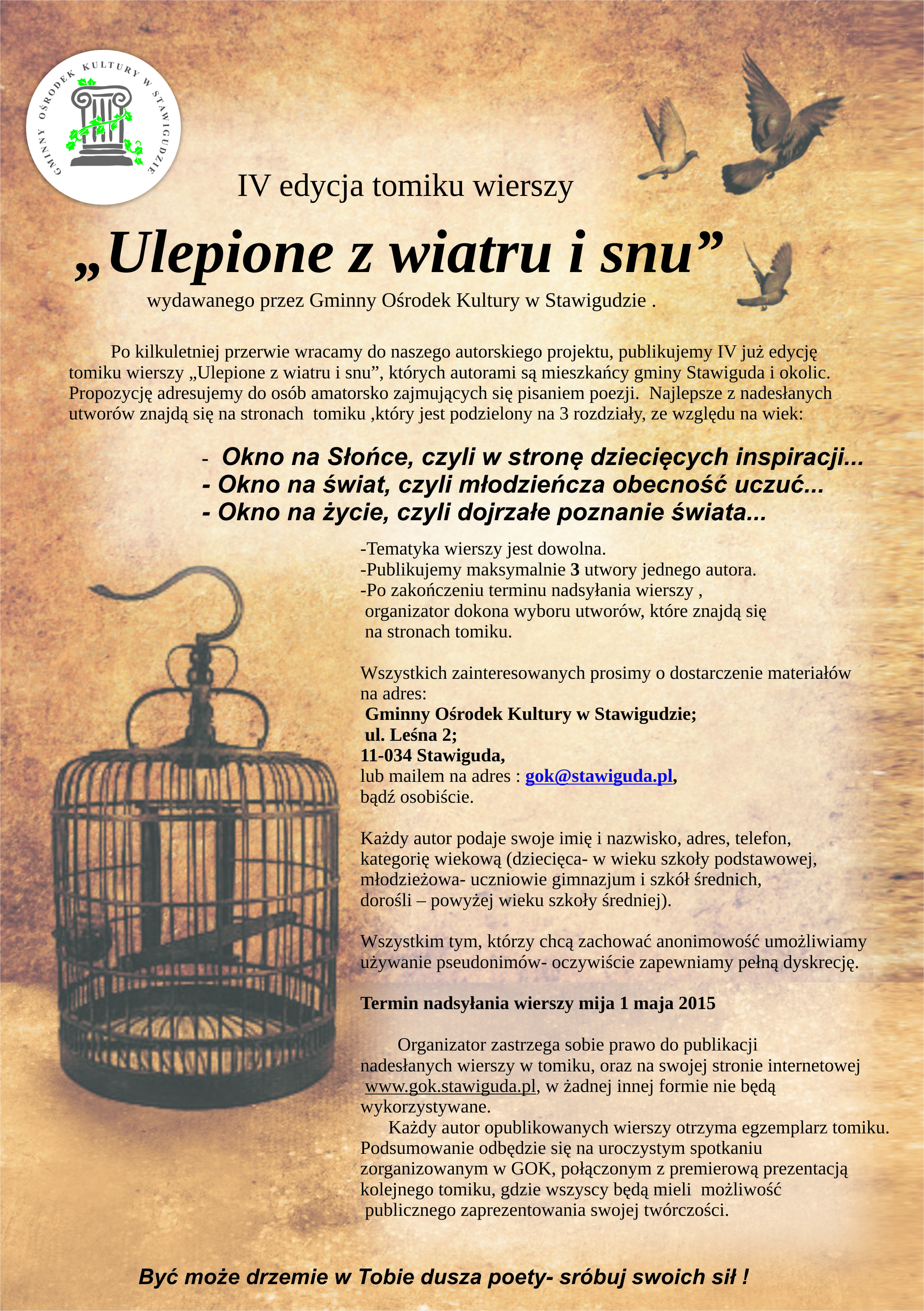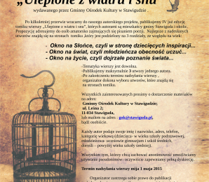 29 kwietnia 2015 Gminny Ośrodek Kultury w Stawigudzie zaprasza na spotkanie i koncert z okazji wydania IV edycji tomiku poezji amatorskiej "Ulepione z wiatru i snu", której autorami są mieszkańcu gminy i osoby z nią związane. Bliższe informacje: gok@stawiguda.pl, tel. 89 512 69 22. Wstęp na spotkanie jest wolny.