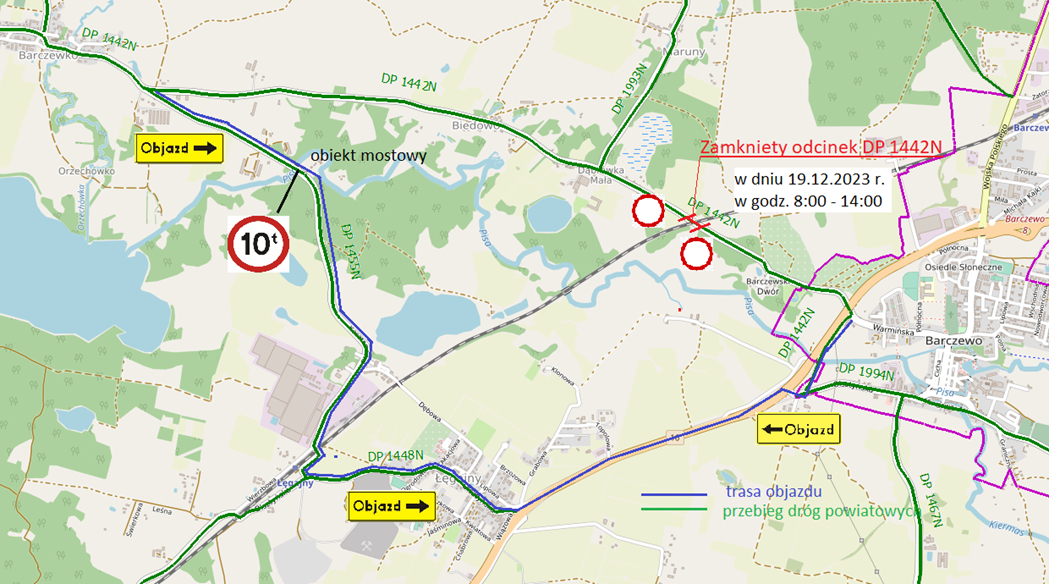 Wyznaczony został objazd do Barczewka/ Barczewa przez Łęgajny. Objazd przeznaczony jest dla pojazdów o całkowitej masie dopuszczalnej nieprzekraczającej 10 ton – nie dotyczy służb ratowniczych oraz pojazdów komunikacji publicznej.