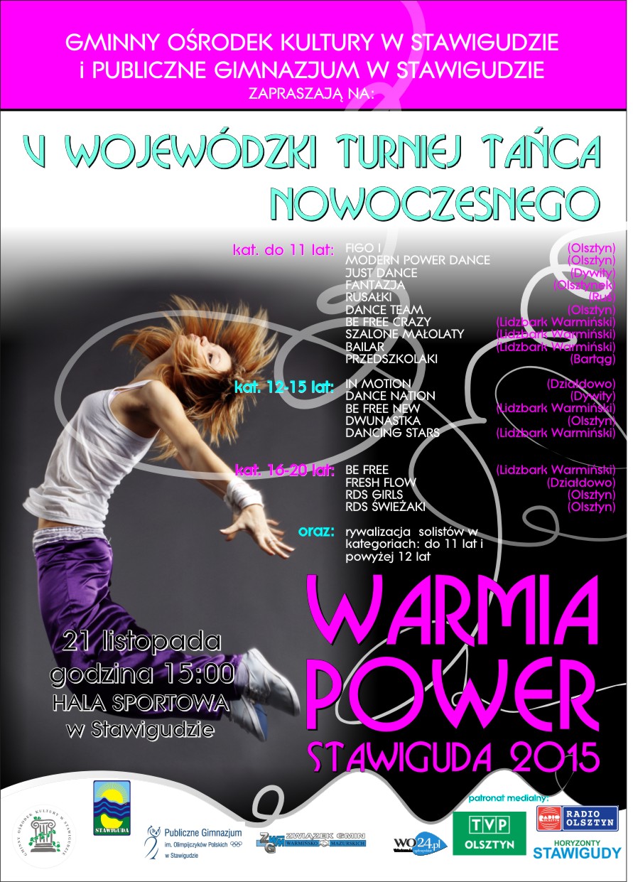 Gminny Ośrodek Kultury w Stawigudzie wraz z Gminą Stawiguda zapraszają 21 listopada 2015 roku w sobotę o godzinie 15:00 na V Wojewódzki Turniej Tańca Nowoczesnego "Warmia Power", który odbędzie się w hali sportowej Publicznego Gimnazjum w Stawigudzie.