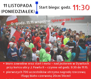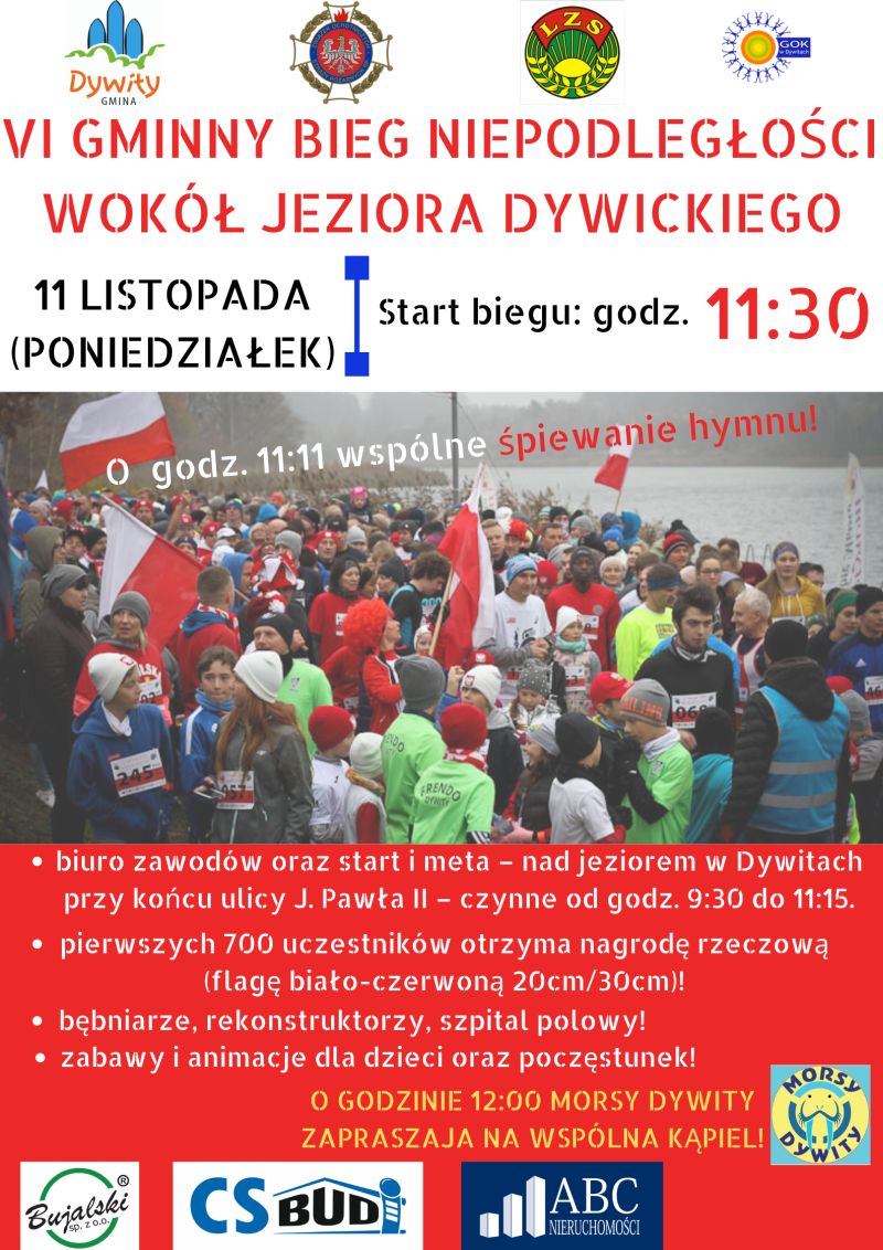 Wspólne śpiewanie hymnu Polski o godz. 11:11, wystrzał z armaty, rekonstruktorzy, bębniarze, pamiątkowe flagi dla pierwszych 700 osób, animacje dla dzieci, poczęstunek i kąpiel w Jeziorze Dywickim z Morsami Dywity – tak w skrócie będzie wyglądał VI Gminny Bieg Niepodległości wokół Jeziora Dywickiego, który odbędzie się 11 listopada. Gmina zaprasza wszystkich mieszkańców do wspólnego, radosnego świętowania! Bieg startuje o godz. 11:30, a udział w nim jest bezpłatny!WAŻNA INFORMACJA! W tym roku z powodu inwestycji zagospodarowania terenów przy głównym zejściu na plażę, start i meta oraz Biuro Zawodów będą zlokalizowane na utwardzonym terenie przy końcu ul. Jana Pawła II w Dywitach (tak, jak miało to miejsce podczas tegorocznej Dywickiej 5-ki)!.