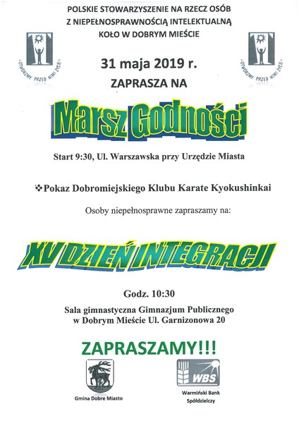 Polskie Stowarzyszenie na Rzecz Osób z Niepełnosprawnością Intelektualną w Dobrym Mieście zaprasza w piątek 31 maja wszystkich mieszkańców, instytucje, przedszkola, szkoły do przemarszu ulicami miasta.