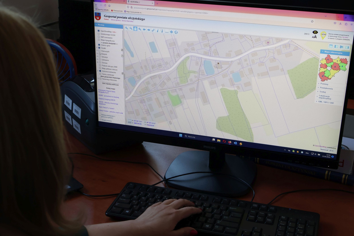 Proces informatyzacji urzędu rozpoczął się w 2009 roku, gdy Powiat Olsztyński zaczął realizację projektu „e-mapa”, polegającego na utworzeniu geoportalu geodezyjnego (nowoczesnego sposobu udostępniania informacji przestrzennej), przetworzeniu danych analogowych do postaci numerycznej i złożeniu cyfrowej ewidencji budynków oraz lokali. Kolejnym krokiem było poszerzenie funkcjonalności tego systemu poprzez rozszerzenie zakresu usług świadczonych tą drogą zainteresowanym. Wiosną 2018 roku ruszyła „e-mapa 2”. Główną ideą projektu było i jest nadal systematyczne zwiększenie ilości dostępnych on-line danych, takich jak ewidencja gruntów i budynków, sieć uzbrojenia terenu i danych topograficznych, czyli informacji, np. o krawężnikach, drzewach, skarpach itp. Dziś jest to już jedna z najpełniejszych baz danych geodezyjnych nie tylko w województwie, ale i w Polsce. Cały czas powiększana i doskonalona. Pozwala na uzyskanie danych z państwowego zasobu geodezyjnego i kartograficznego oraz składanie dokumentów bez wychodzenia z domu, przez 24 godziny na dobę.