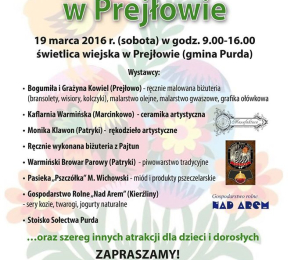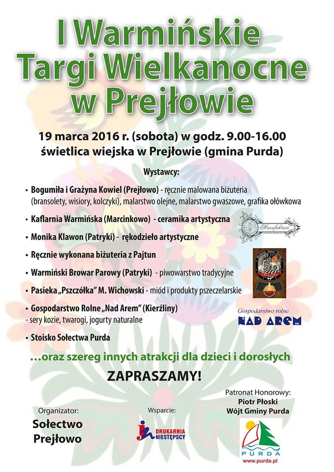 Gmina Purda zaprasza w sobotę 19 marca 2016 roku na I Warmińskie Targi Wielkanocne w Prejłowie, które odbędą się w świetlicy wiejskiej. Zachęcamy twórców rękodzieła oraz wytwórców lokalnych produktów spożywczych z terenu sołectwa i całej gminy Purda do wzięcia udziału w targach. Chętni proszeni są o kontakt pod numerem telefonu: 668 498 421. Udział w targach dla wystawców jest bezpłatny. Ilość miejsc ograniczona.