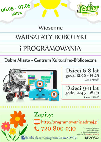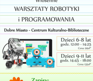 Centrum Kulturalno-Biblioteczne w Dobrym Mieście zaprasza dzieci w dniach 6-7 maja na wiosenne warsztaty robotyki i programowania.