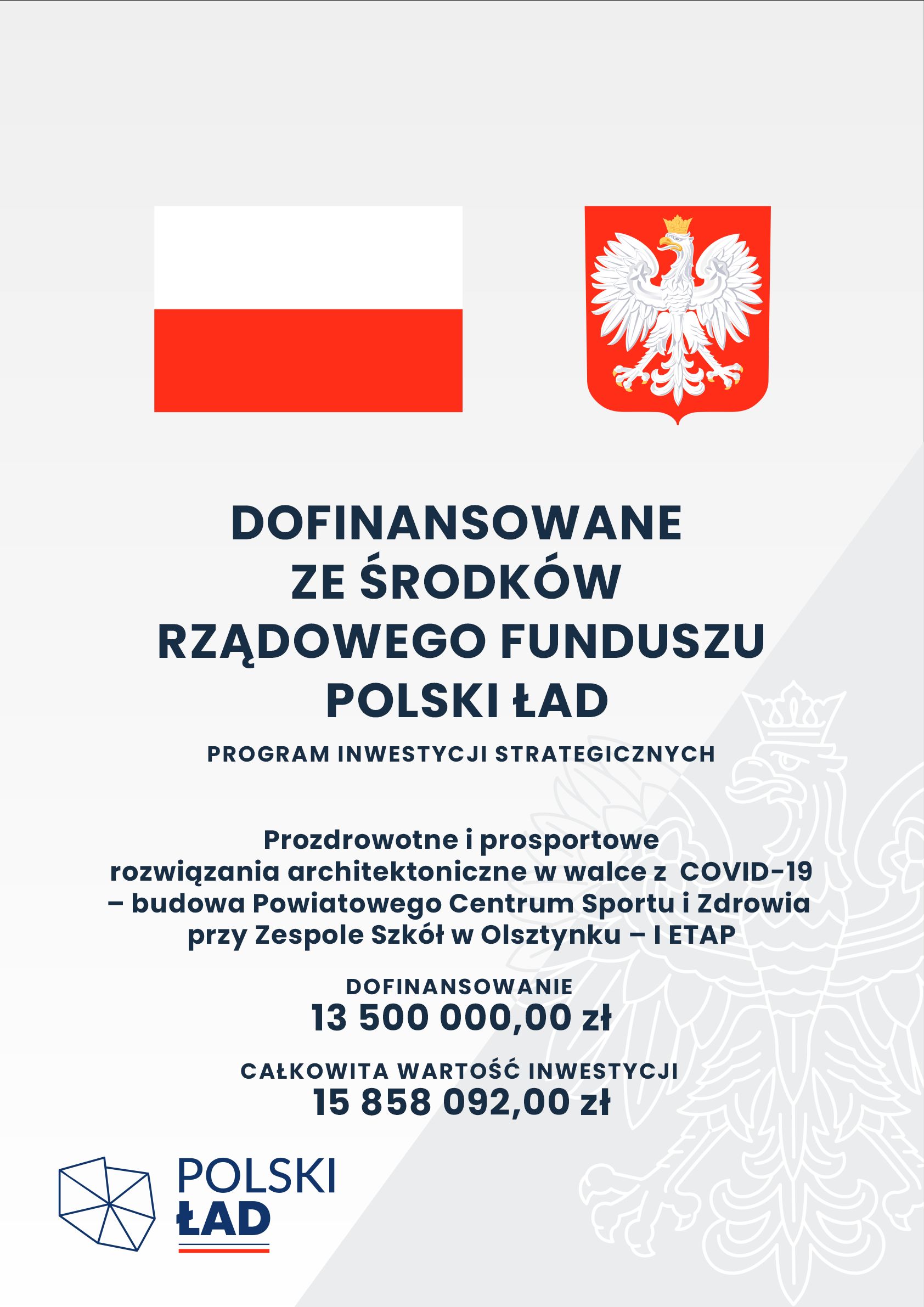 Koszt budowy wraz z opracowaną dokumentacją to niecałe 16 mln zł, z czego większość, bo 13,5 mln zł, pochodzi z Rządowego Funduszu Polski Ład: Program Inwestycji Strategicznych. Pozostałe środki, w kwocie 2,36 mln zł, to wkład własny z budżetów Powiatu Olsztyn i Gminy Olsztynek.