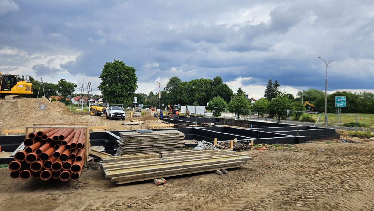 Widać już zmiany na placu budowy: wykonywane są wykopy fundamentowe, instalacja sanitarna i deszczowa podsadkowa oraz zbrojenie konstrukcyjne ław fundamentowych i szybu windowego. Wylany został chudy beton podkładowy pod ławy fundamentowe. Roboty budowlane mają potrwać do sierpnia 2026 r. Wykonawcą prac jest firma Rembud Sp. z o.o. z Przasnysza.