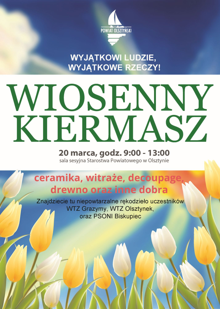W środę 20 marca w godz. 9-13 w sali sesyjnej Starostwa Powiatowego w Olsztynie (pl. Bema 5) odbędzie się WIOSENNY KIERMASZ.