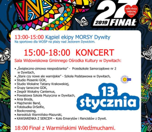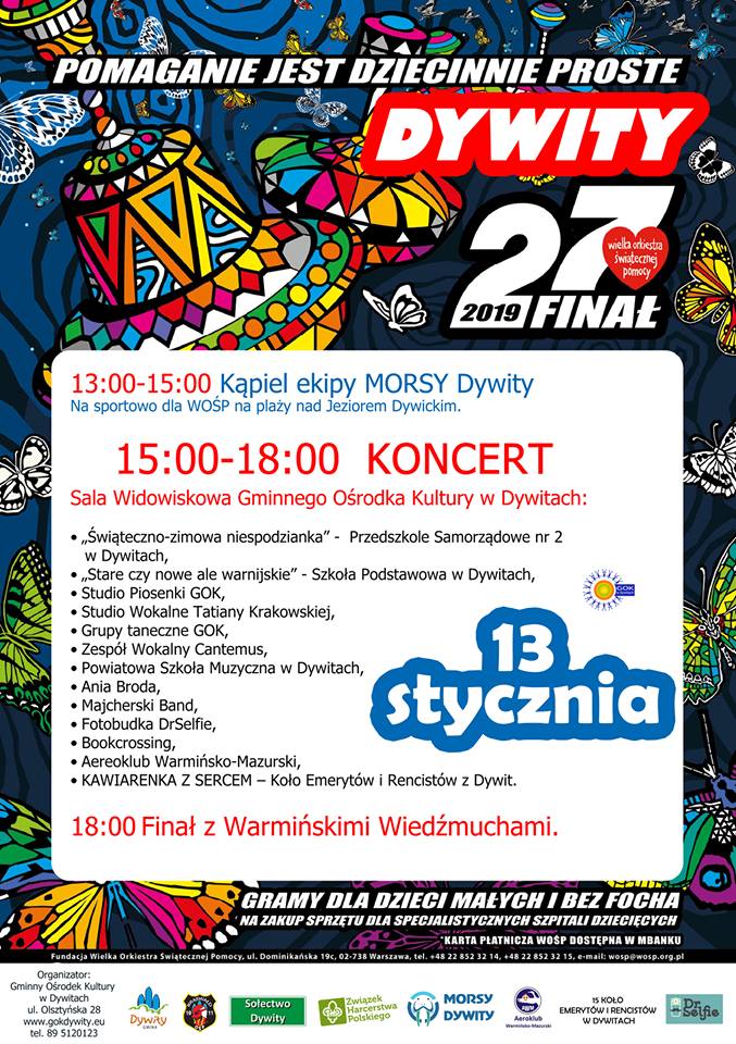 W najbliższą niedzielę 13 stycznia 2019r. w Gminie Dywity ponownie zagra najgorętsza orkiestra na świecie!!! Zapraszamy do wspólnego grania z Wielką Orkiestrą Świątecznej Pomocy na rzecz najmłodszych dzieci. Od godz. 13:00 do 15:00 WOŚP zagra na sportowo z Morsami Dywity nad Jeziorem Dywickim, a w godz. 15:00-18:00 z Wiedźmuchami, Orkiestrą Powiatowej Szkoły Muzycznej I stopnia w Dywitach, Anią Brodą i wieloma innymi artystami i ludźmi dobrej woli w GOK Dywity. Cały czas można też wspierać dywicki sztab WOŚP ciekawymi przedmiotami i gadżetami na licytacje. Można je przynosić do GOK Dywity w godz. 8:00-16:00 lub po wcześniejszym umówieniu do godz. 20:00. Zachęcamy do wsparcia!
