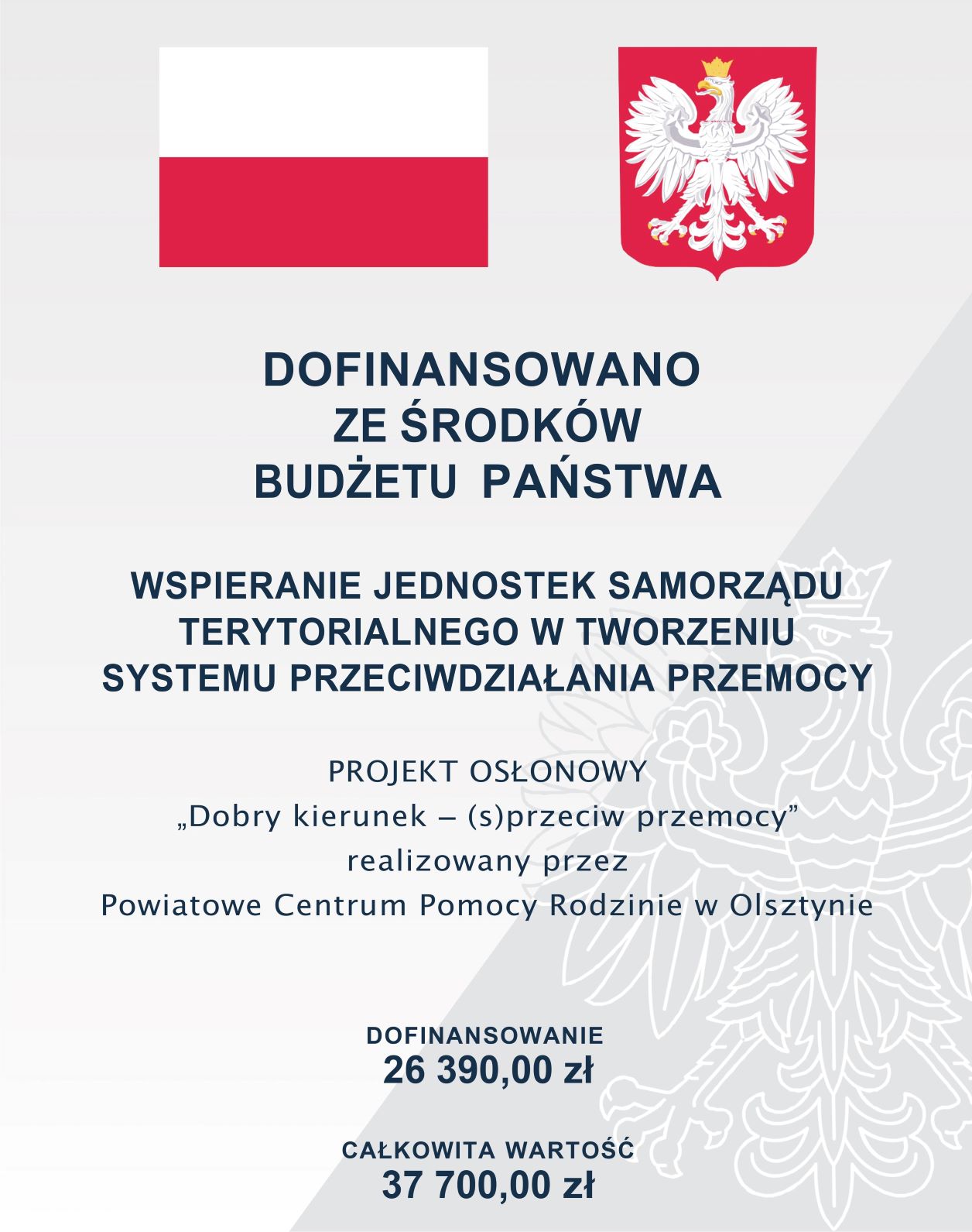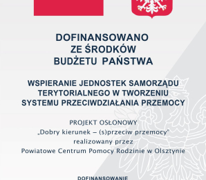 Powiatowe Centrum Pomocy Rodzinie w Olsztynie jest realizatorem projektu w ramach Programu Osłonowego „WSPIERANIE JEDNOSTEK SAMORZĄDU TERYTORIALNEGO W TWORZENIU SYSTEMU PRZECIWDZIAŁANIA PRZEMOCY W RODZINIE”, pt. „Dobry kierunek – (s)przeciw przemocy”.