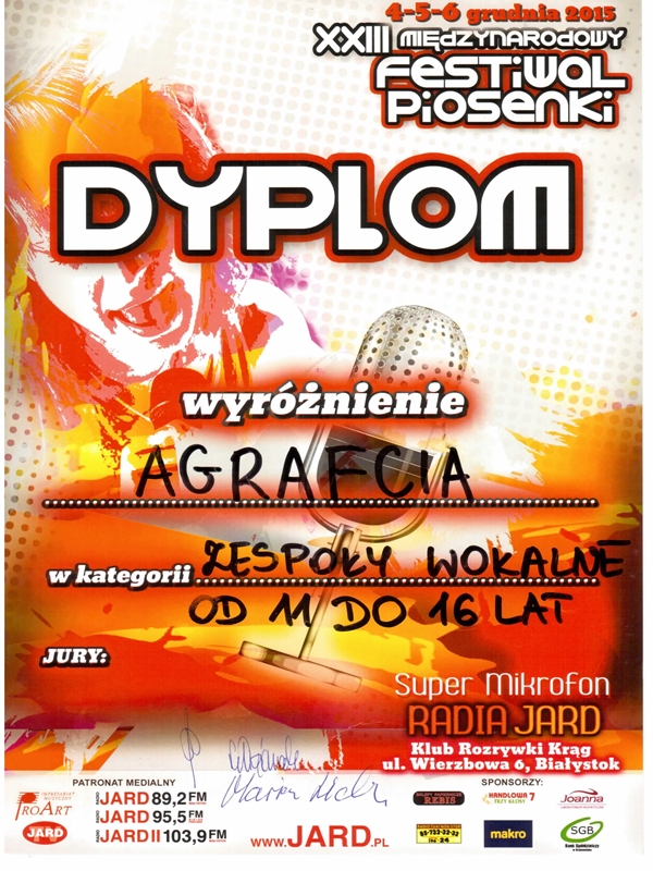 Działający w Gminnym Ośrodku Kultury w Kolnie zespół AGRAFCIA zdobył wyróżnienie w 23. Międzynarodowym Festiwalu Piosenki "Super Mikrofon Radia Jard", który odbył się w dniach 4-6 grudnia w Białymstoku. Festiwal cieszy się niezwykłą popularnością wśród dzieci i młodzieży.