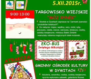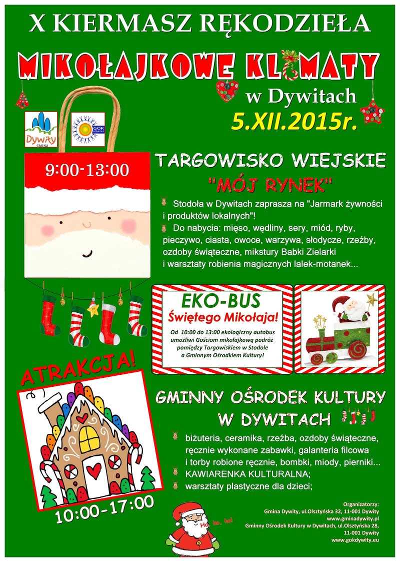 Gminny  Ośrodek Kultury w Dywitach zaprasza do udziału w świątecznym kiermaszu "Mikołajkowe Klimaty", który odbędzie się w sobotę 5 grudnia 2015 roku w godzinach 10:00-17:00 GOK w Dywitach.