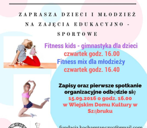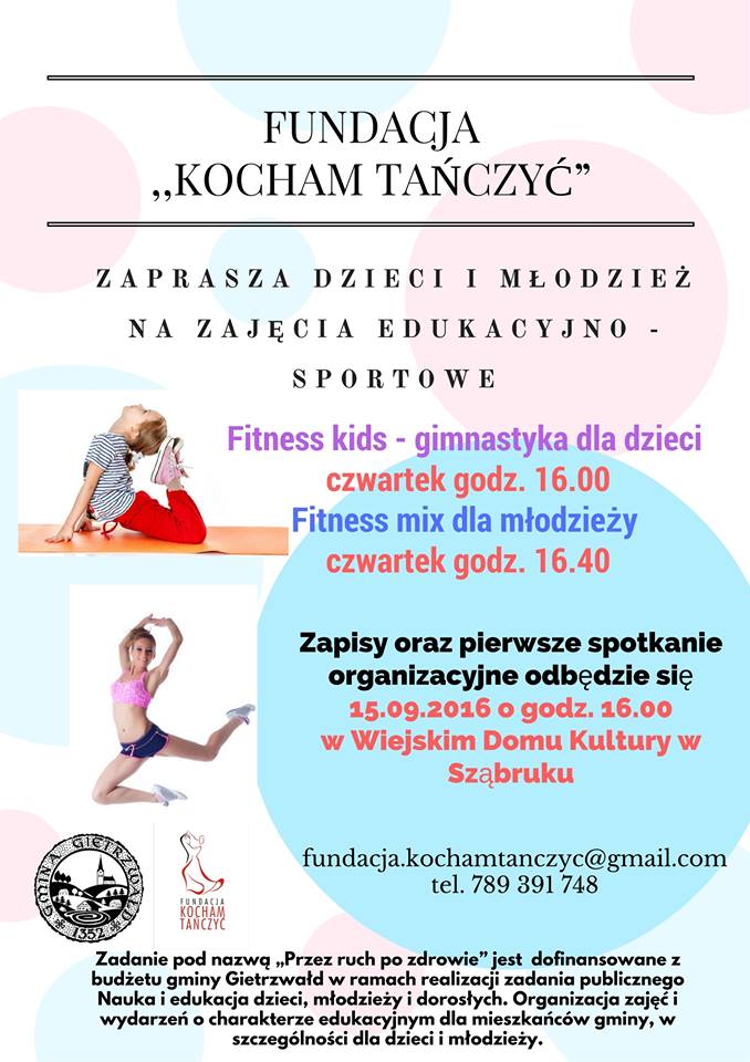 Gmina Gietrzwałd i Fundacja Kocham Tańczyć zapraszają dzieci i młodzież na zajęcia edukacyjno-sportowe. Pierwsze spotkanie i zapisy odbędą się w czwartek 15 września o godz. 16:00 w Wiejskim Domu Kultury w Sząbruku.